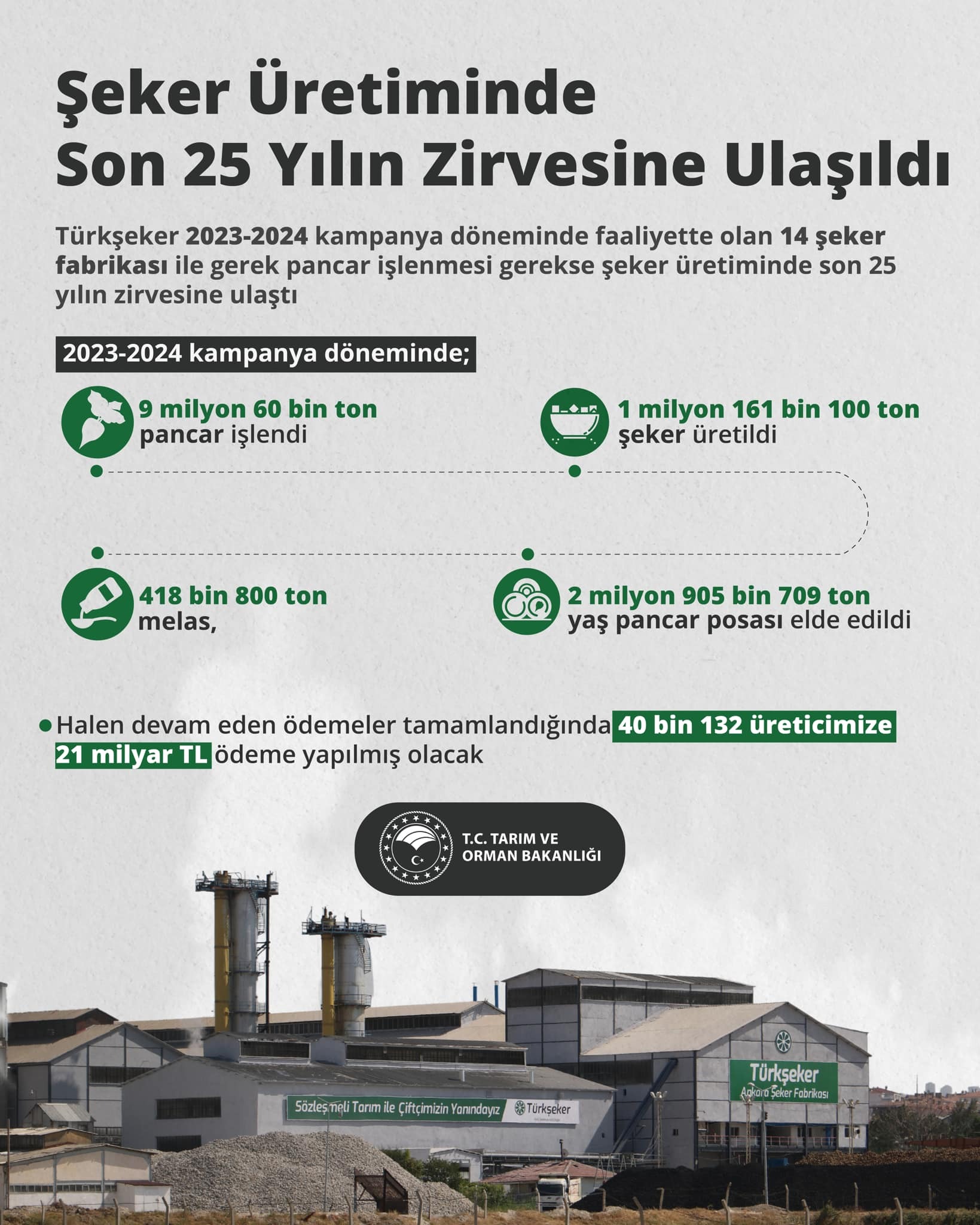 Tarım ve Orman Bakanı İbrahim Yumaklı, yaptığı açıklamada, yüzde 37'lik payla sektördeki en büyük şeker şirketi olan 98 yıllık tarihe sahip Türkşeker'in, 2023-2024 kampanya döneminde faaliyette bulunan 14 şeker fabrikasıyla gerek pancar gerekse şeker üretiminde son 25 yılın zirvesine ulaştığını duyurdu.